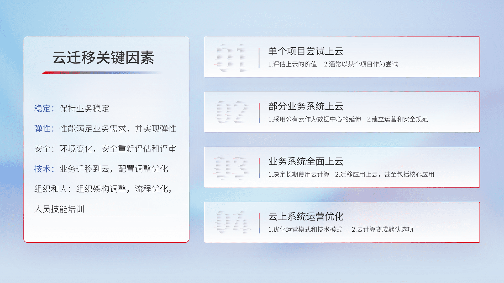 结合实际业务,,从规划设计、、、云平台选型、、云原生改造、、、、数据迁移、、、集成交付,,迁移全过程为客户识别最佳上云路径,,做好风险识别管理,,设计网络架构、、、、身份权限、、、安全审计合规、、、操作审计、、、日志审计、、监控告警策略、、、多站点容灾设计等,,,,对云上基础设施进行整体规划,,,,提升IT治理水平,,,以满足弹性、、、、高可用、、高性能的需求。。。。