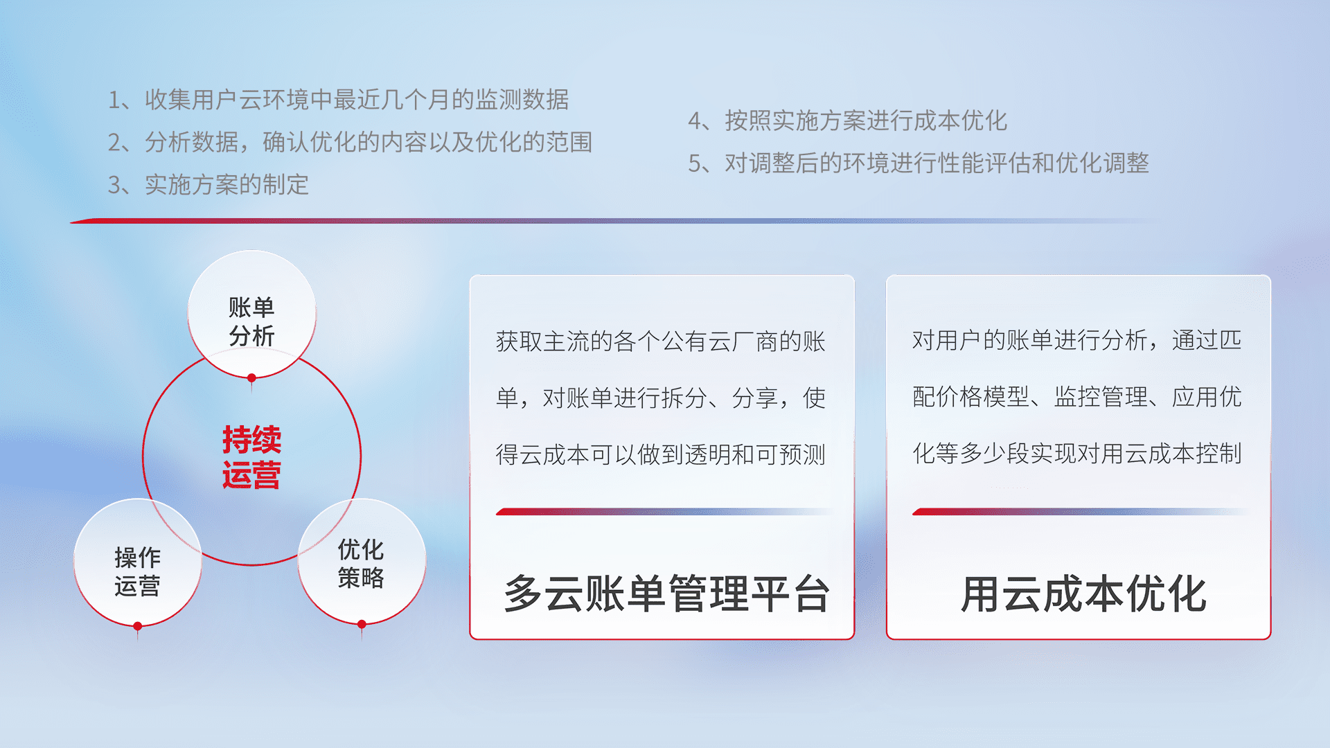 通过多云纳管,,,以统一的资源数据模型把客户的云资源进行抽象和封装,,进而实现对多云资源的统一操作,,,,保障云资源管理的可靠性、、稳定性与可用性。。。量身定制化运维内容,,,配置、、开发运维、、补丁管理、、、备份、、、监控、、、认证和访问管理、、、审计和日常巡检等,,,,保障在用云过程中的可靠度,,,稳定度以及高可用率。。。。